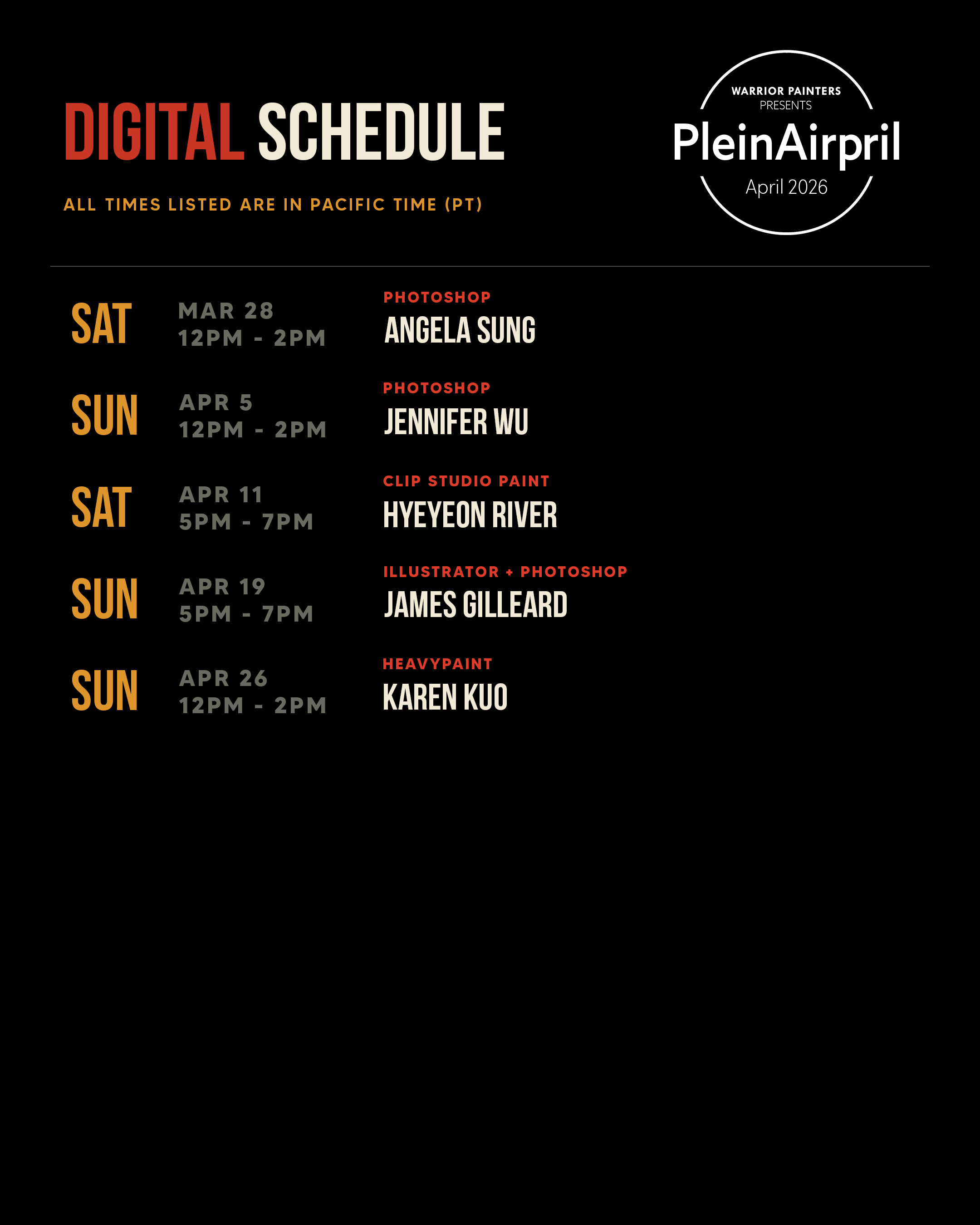 Digital painting demos by Angela Sung @angothemango, Jennifer Wu @paluumin, Hyeyeon River @hyeyeon_river, James Gilleard @jamesgilleard, and Karen Kuo @lestatuskuo.
